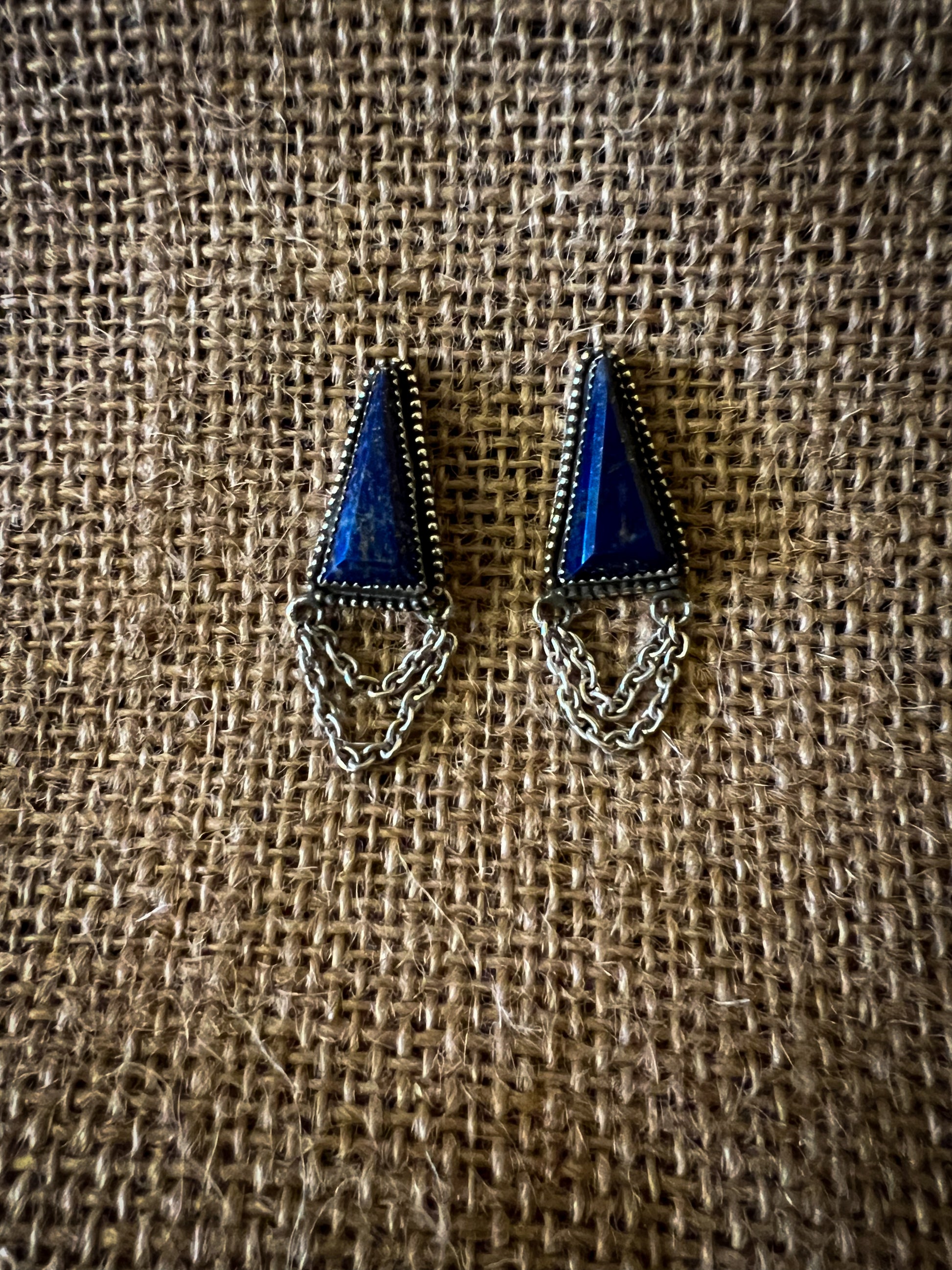 Triangle blue lapis lazuli stud earrings set in .925 sterling silver with double layer chain