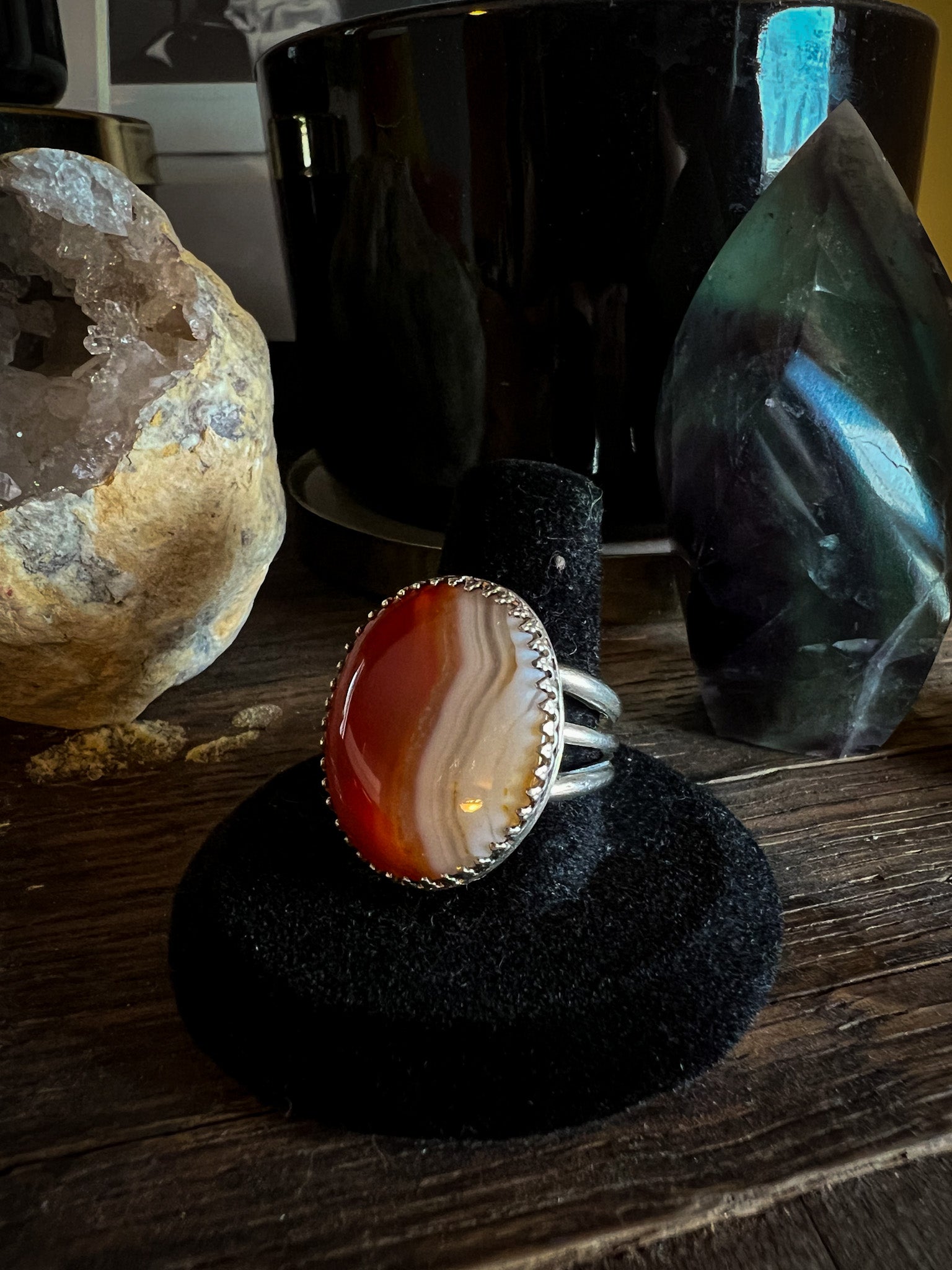 The agate is set in a sleek .925 sterling silver band, which complements the stone's natural colors with its shiny, polished finish. The sterling silver provides durability and elegance, allowing the striking patterns of the Botswana agate to take center stage.