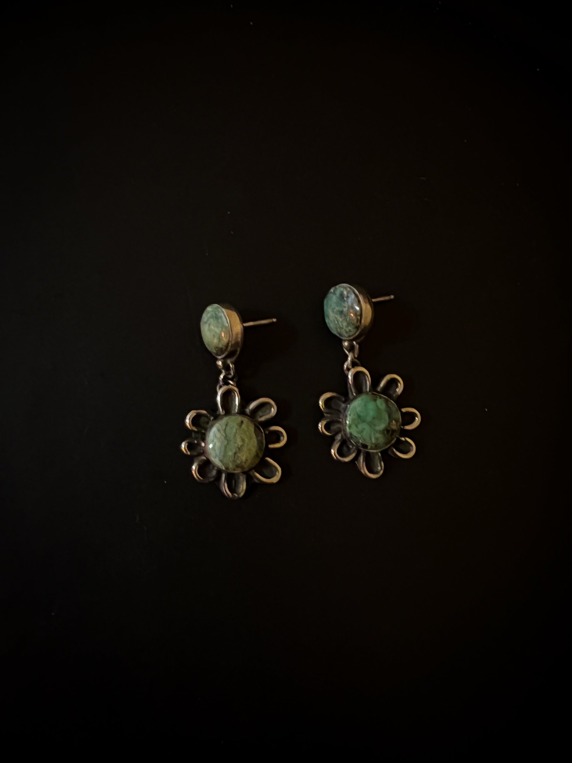 Round turquoise cabochons set in a .925 sterling silver bezel designed as dangling flowers