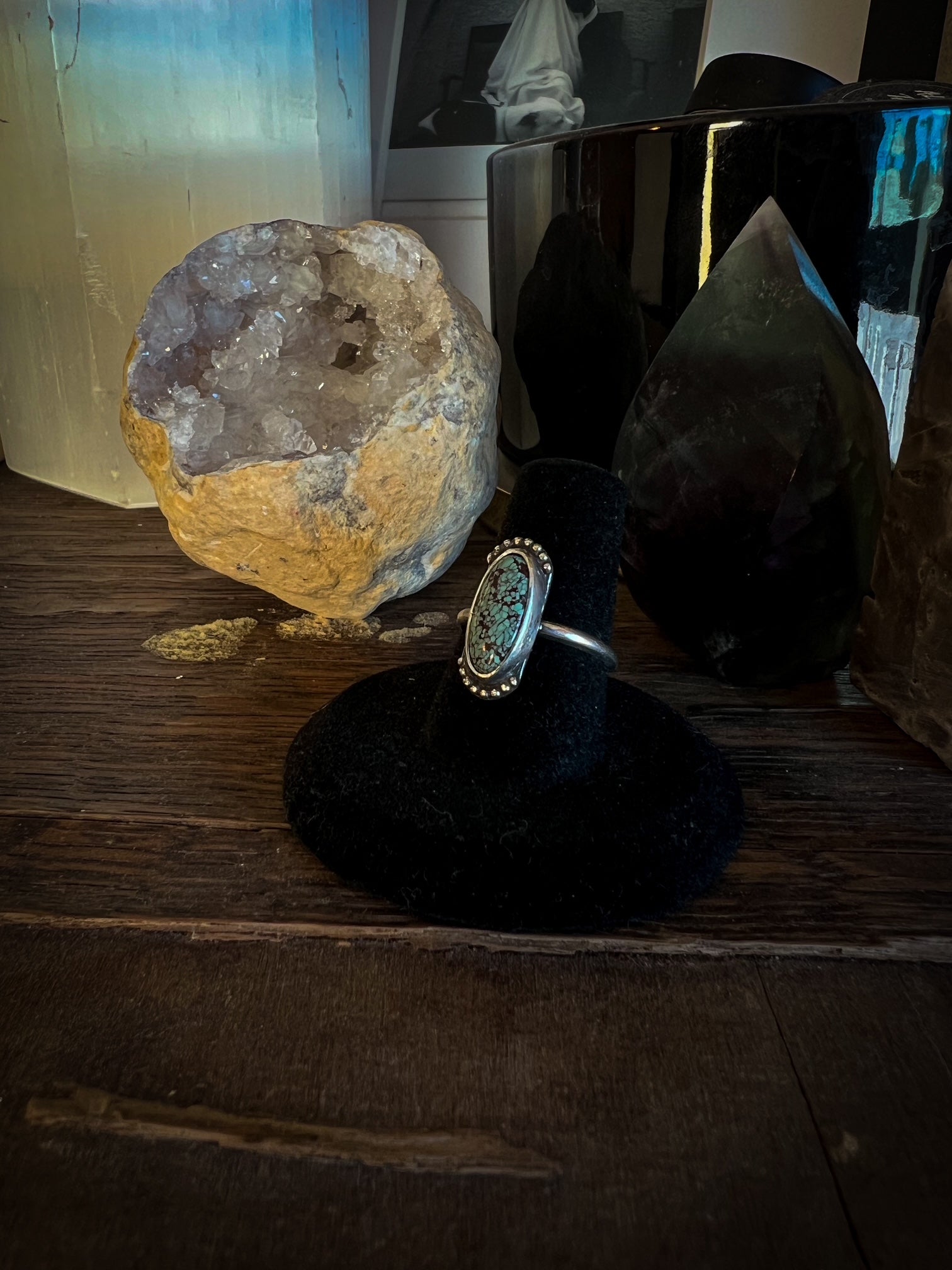 The surfboard Green Egyptian Turquoise Ring in .925 sterling silver with a single half domed band.