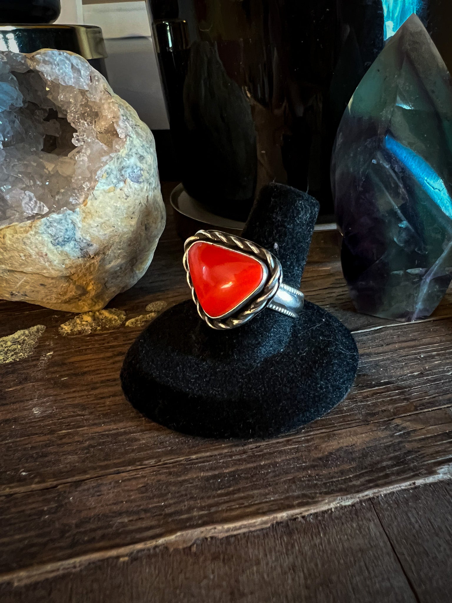 The Rosarita Ring in .925 sterling silver is a bold and unique piece of jewelry that exudes both elegance and craftsmanship. The ring features a stunning Rosarita stone, a deep red or pinkish-red gemstone known for its rich, vibrant color and smooth finish.